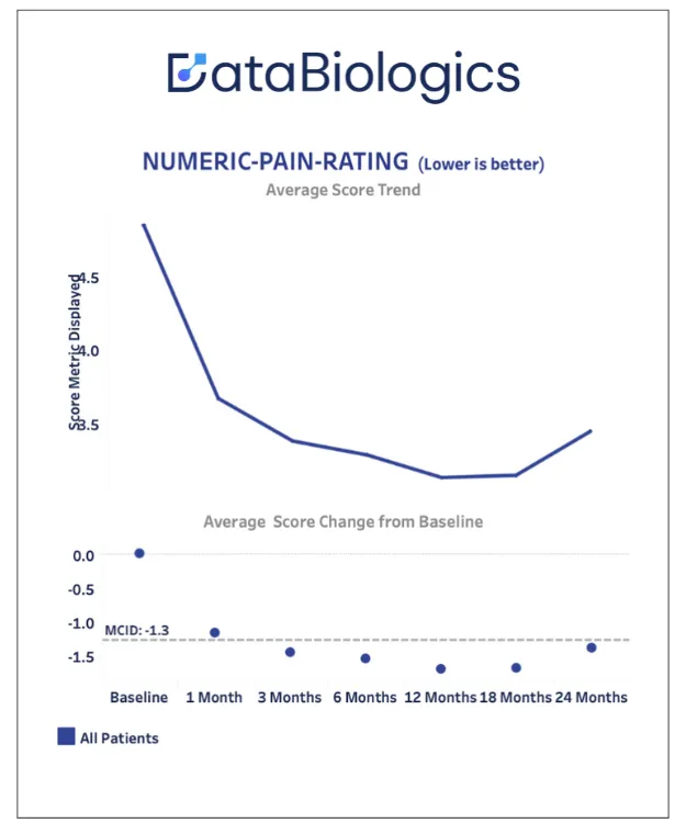 Utilizing the DataBiologics platform, patients demonstrate a steady decrease in pain ratings up to 24 months post-PRP therapy.